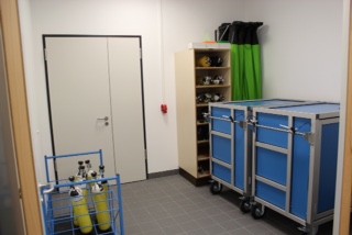 Angeschlossen an den Weißbereich befindet sich das Materiallager. Im Lager haben wir unsere Füllleiste, die mit dem im Nebenraum befindlichen Kompressor verbunden ist. Sie ermöglicht das schnelle und sichere füllen unserer gebrauchten Atemluftflaschen. An der Wand sind platzsparend die Chemikalienschutzanzüge für den Übungsdienst angebracht und ein Schrank mit den einsatzbereiten Atemluftflaschen. Zudem verfügen wir über einen fahrbaren Flaschenwagen und zwei Rollcontainer, in dem wir 8 einsatzbereite Atemschutzgeräte mit 8 Masken und 7 Reserveflaschen befördern können. Die Rollcontainer ersetzen das alte Regalsystem, in dem früher die Einsatzbereiten Atemschutzgeräte gelagert wurden. Dadurch das die Rollcontainer gleichzeitig Lagerfläche sind, entfällt ein zeitaufwändiges umladen und das einsatzbereit Material kann direkt mit den Rollcontainern auf dem MZF 3 verladen und an die Einsatzstelle gebracht werden.
